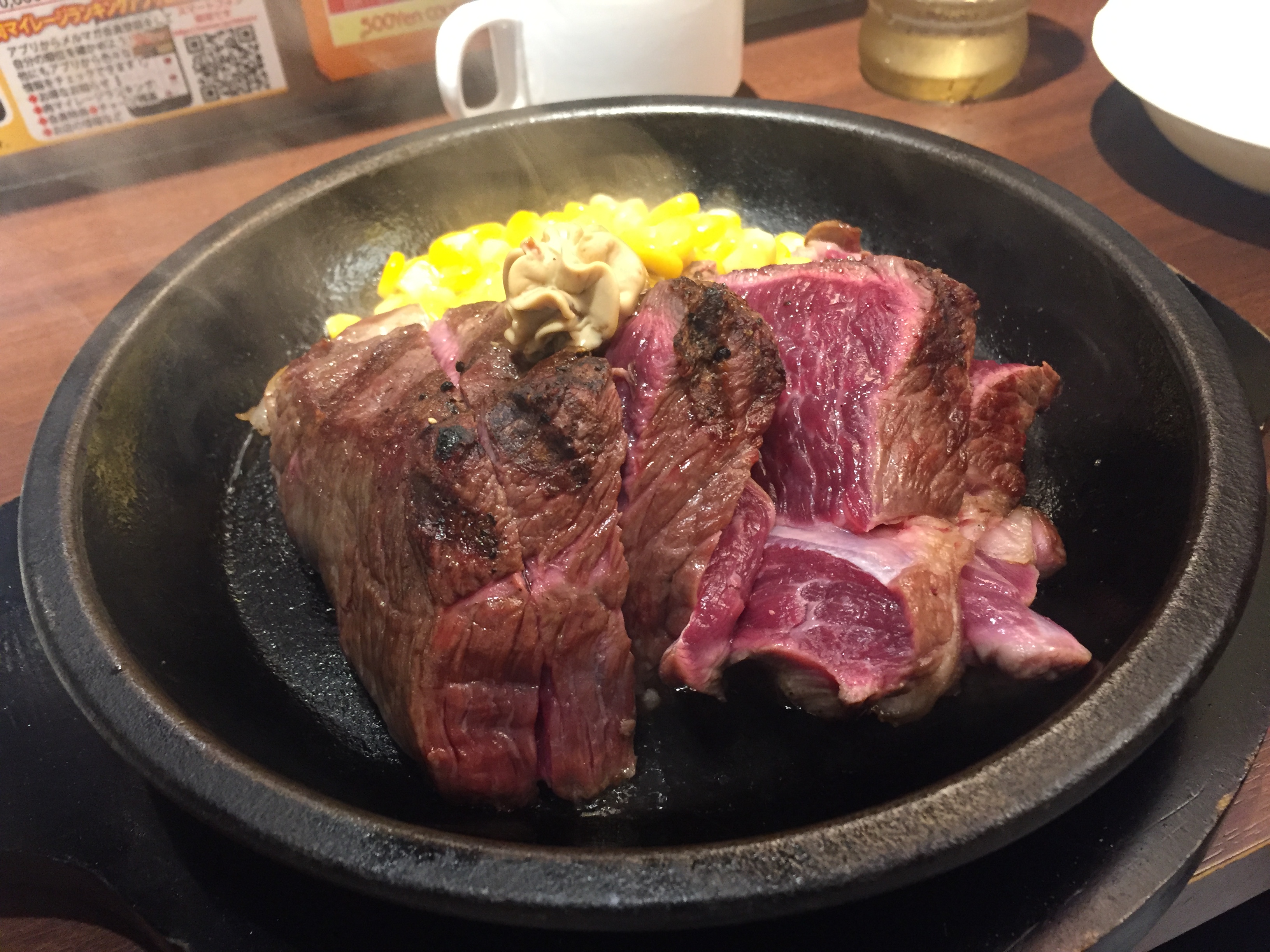 ワイルドステーキなので、手で食いたいところですが、鉄板から煙が立ち上っているので、ここは我慢してフォークを使います。