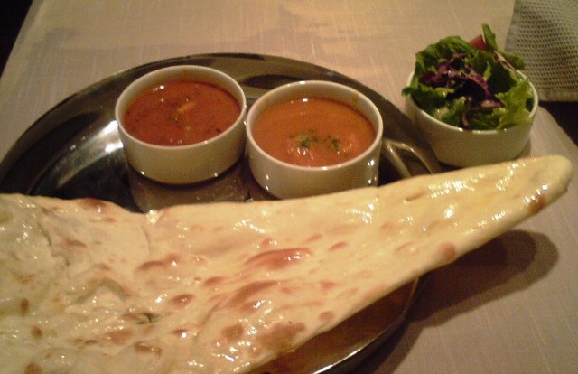 カレー2種類、タンドリーチキン、パパドロースト、窯焼きナン/サフランライス、サラダ、コーヒー/チャイ(HOT/ICE)/ラッシーICEで1,500円。