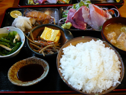 1,500円で刺身盛り合わせ、煮魚・煮大根、生野菜、付け合わせ3品、香の物が付いてきます。