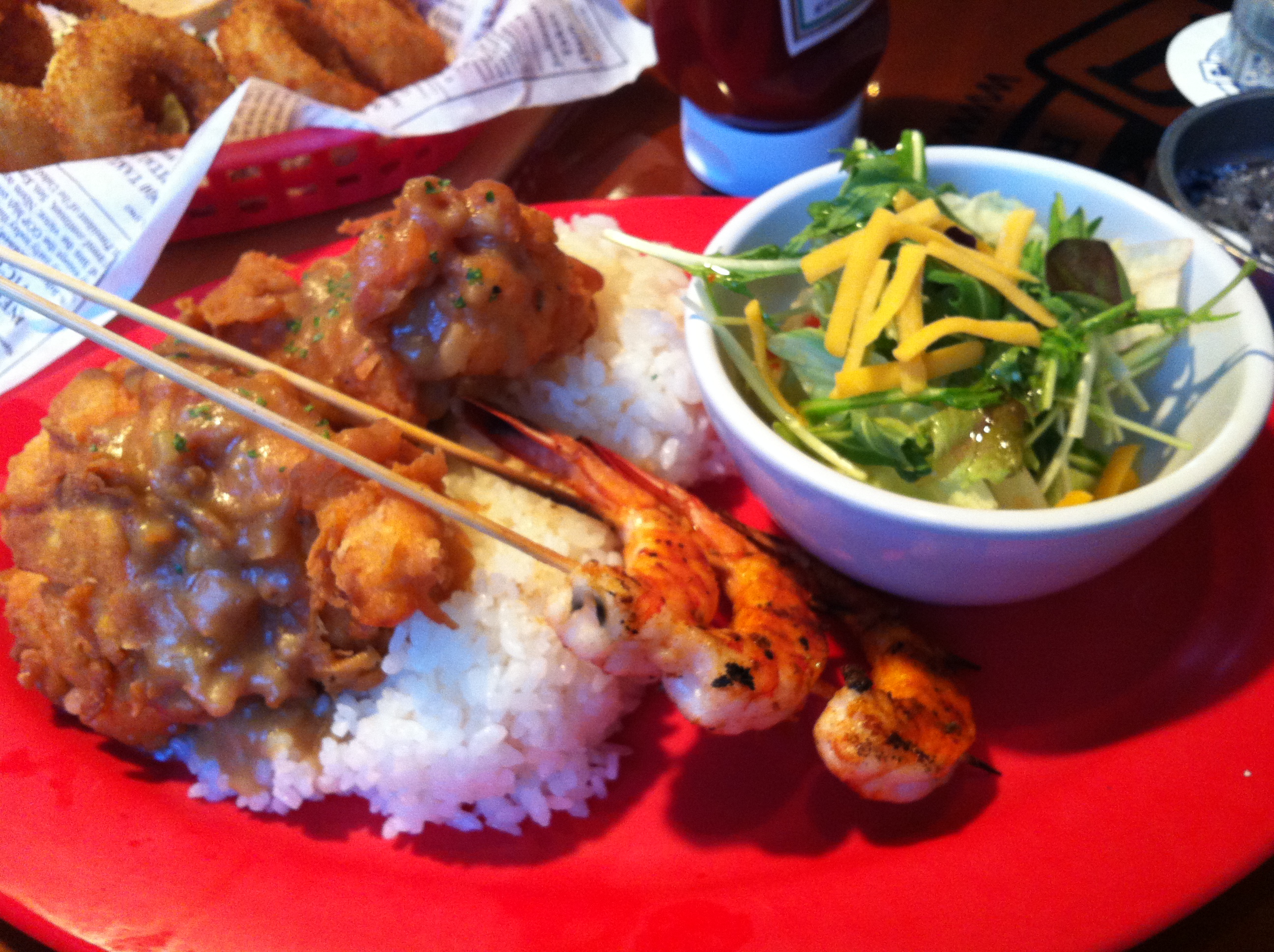 ランチでも丼飯ほどのライスとケンタよりデカいチキンが二つ、そして大きめのエビが3匹お供しています。
