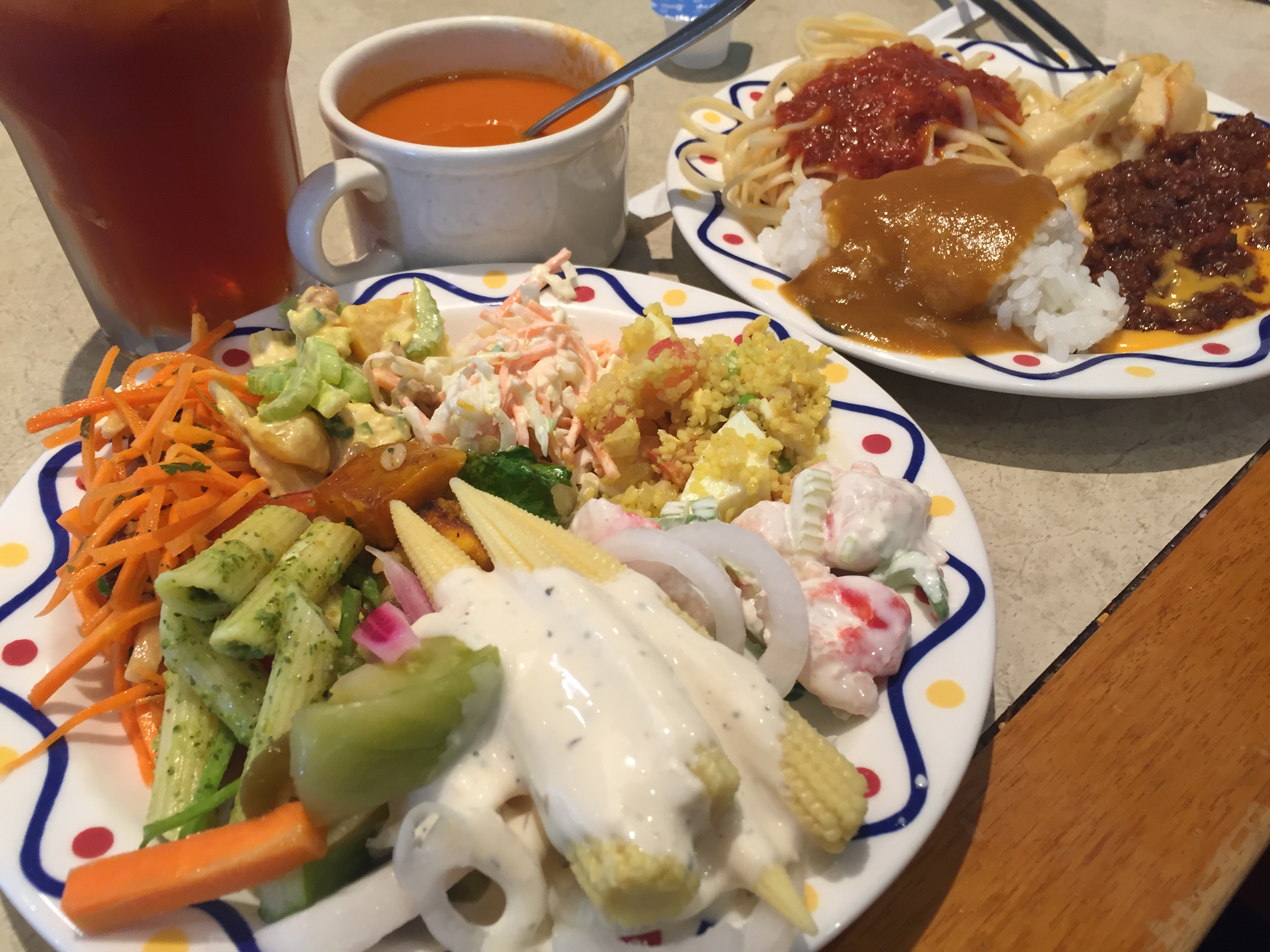 プレート2枚取り放題+ドリンク2杯+デザート+スープ付き。